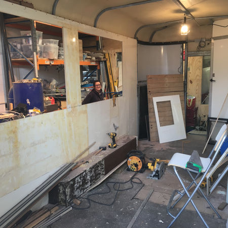 Covering the patchy white glassfibre bodywork was key. A wood-effect wrap did the job. We cut and rebuilt the internal structure, adding windows and a very big sales hatch.